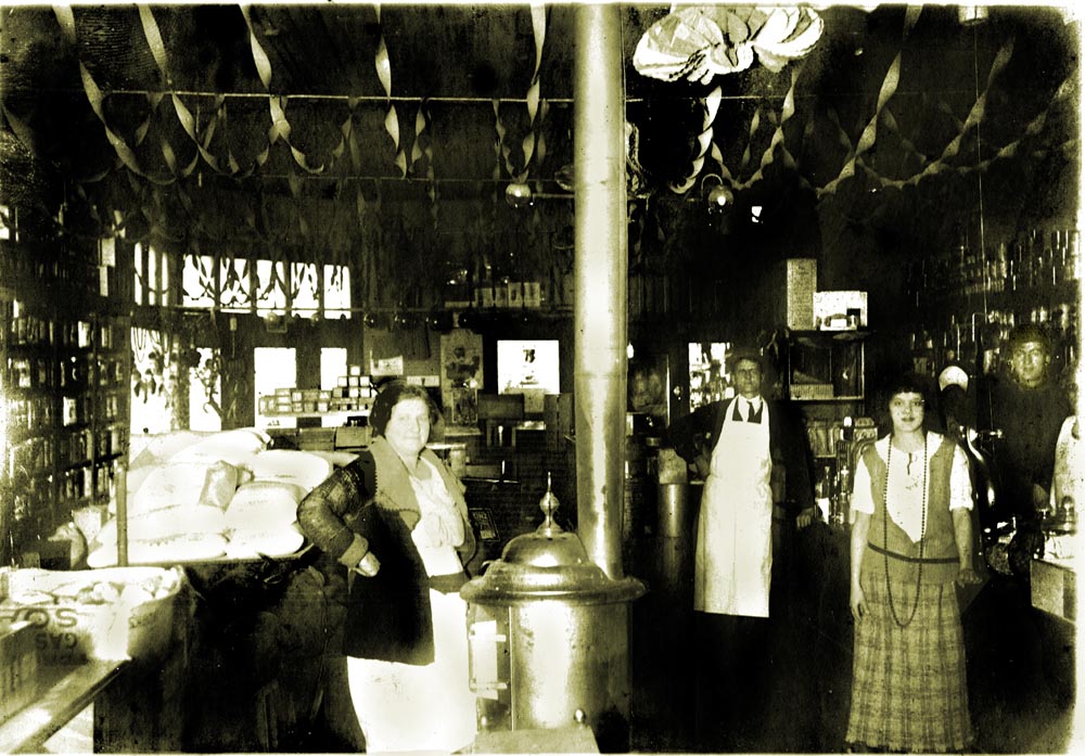 The store must have been on a corner, as the front door is at an angle to the walls. "1927 Business Ads" posted