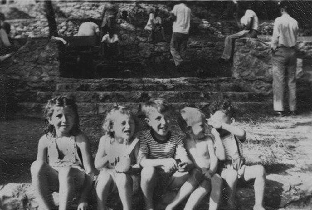 Rayma (Smith) Grimes, Opal (Canady) Trites, Joe Linthicum, Harold Canady, Larry Linthicum at a family reunion at Schemerhorn Park, about 1947 or 48