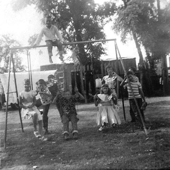 East of the grade school in Cardin.In the Lowery family's back yard.June Skelton, Glen Fox, Tommy Richardson, Wanda Lowery, Shelia LoweryThe two on the end are uncertain but could be Sherry Garrett and Fred VonMossOn top is John Lowery