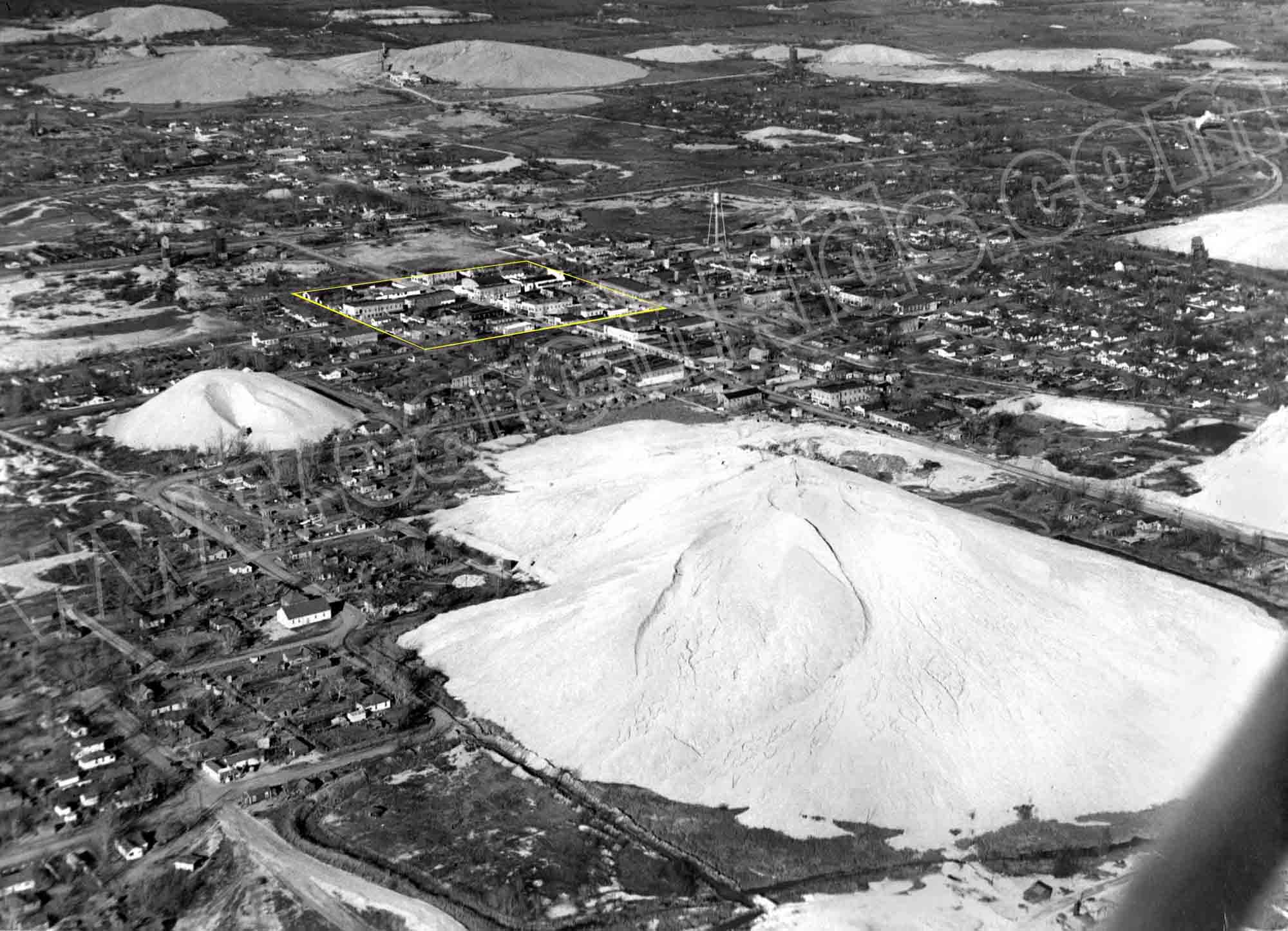 | The area marked by the yellow box is the four blocks of Main Street that were condemned in 1950 because of the possibility of a cave in was deemed imminent. That marked the beginning of the end of Picher, Oklahoma. Now, (2015) 65 years later that area has not collapsed, but the entire town, along with Cardin and Treece, KS has been bought out and destroyed because of the "possibility" of collapse. |