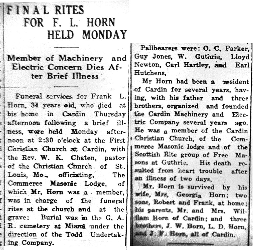 Frank L. Horn, W. K. Chaten, O. C. Parker, Guy Jones, w. Guthrie, Lloyd Newton, Carl Hartley,Earl Hutchens, Georgia Horn, Robert Horn, Frank Horn, William Horn, J. W. Horn, L. D. Horn, J. F. Horn