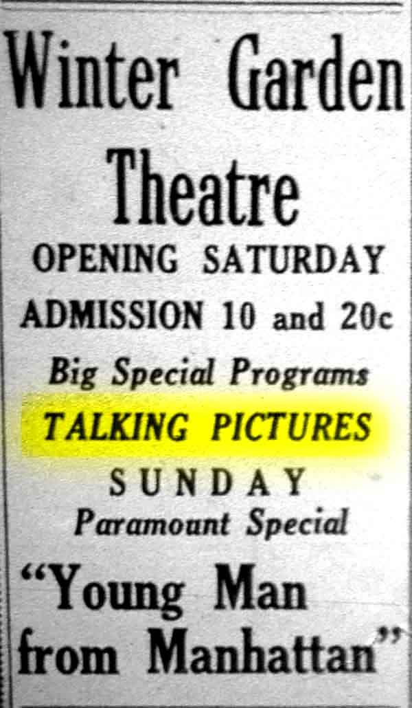 The address for the Winter Garden was 116 E. 2nd.Don't you just love it that they have to advertise talking pictures??