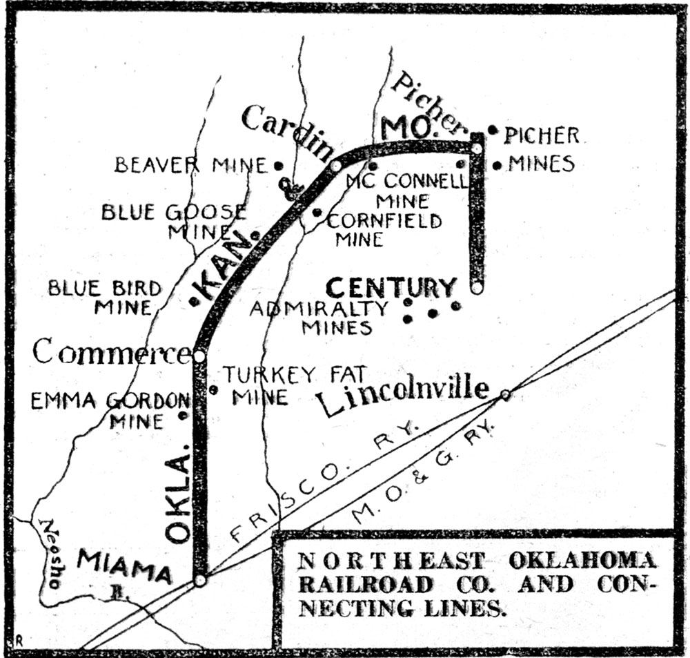 | A map of the Northeast Oklahoma Railroad trolley lines. Apparently from the 1920s due to the names used. Of course, this map is flawed because Quapaw is listed as Lincolnville. Near the Blue Bird Mine was "Bluebird Crossing" later to be known as Potter Station |