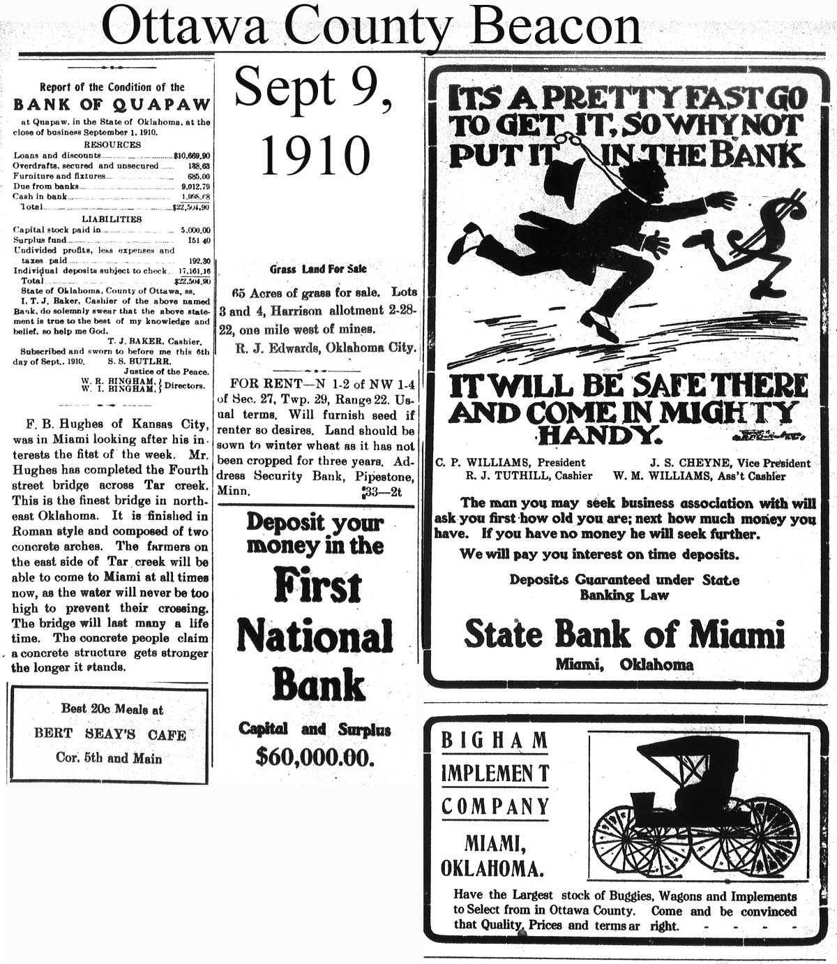 | It was a much simpler time. However, that early, we had absentee land owners. The bridge over Tar Creek on East Central had just been finished. You could get a good meal for twenty cents. Buggies and wagons were advertised instead of cars and trucks. The total assets of the First national bank wouldn't buy much of a 2015 car. |