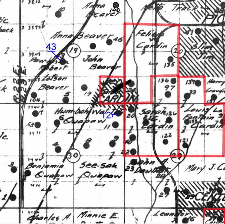 The "Cardin" allotments are bordered in red. William Oscar received his 240 acres in 5 parcels,