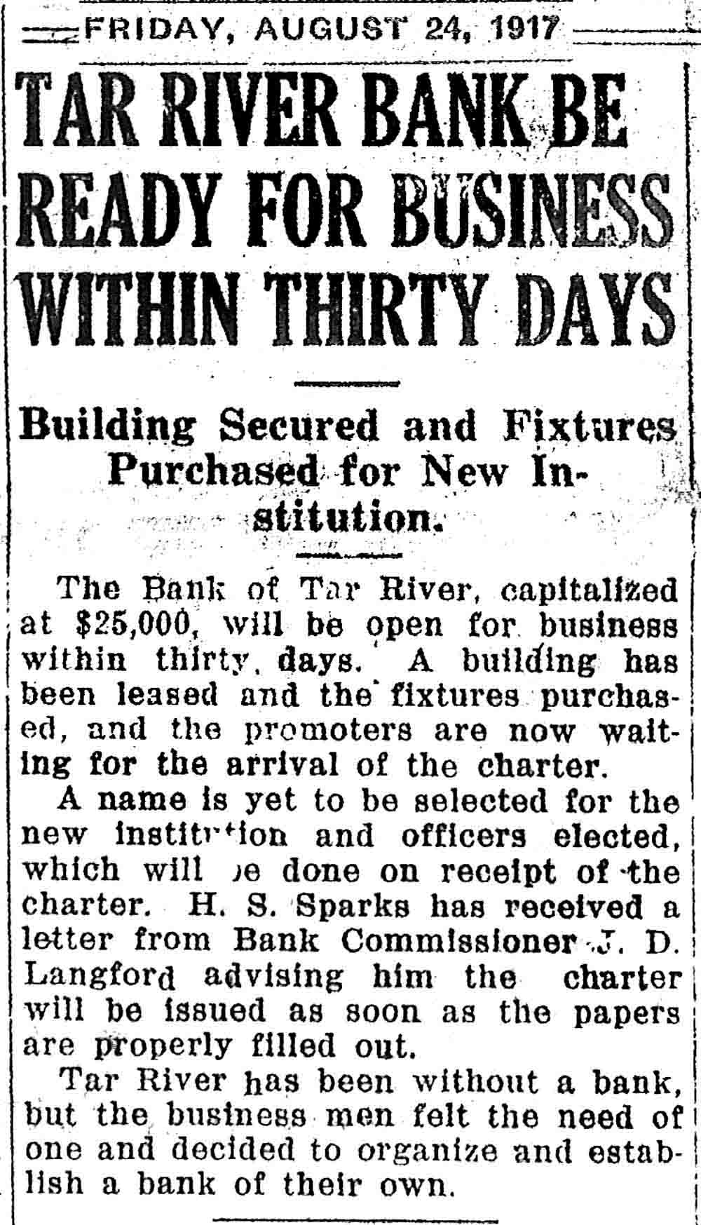 According to this, The Bank of Tar River was perhaps the first!Since the name is yet to be selected, This COULD be the Mineral Belt Bank