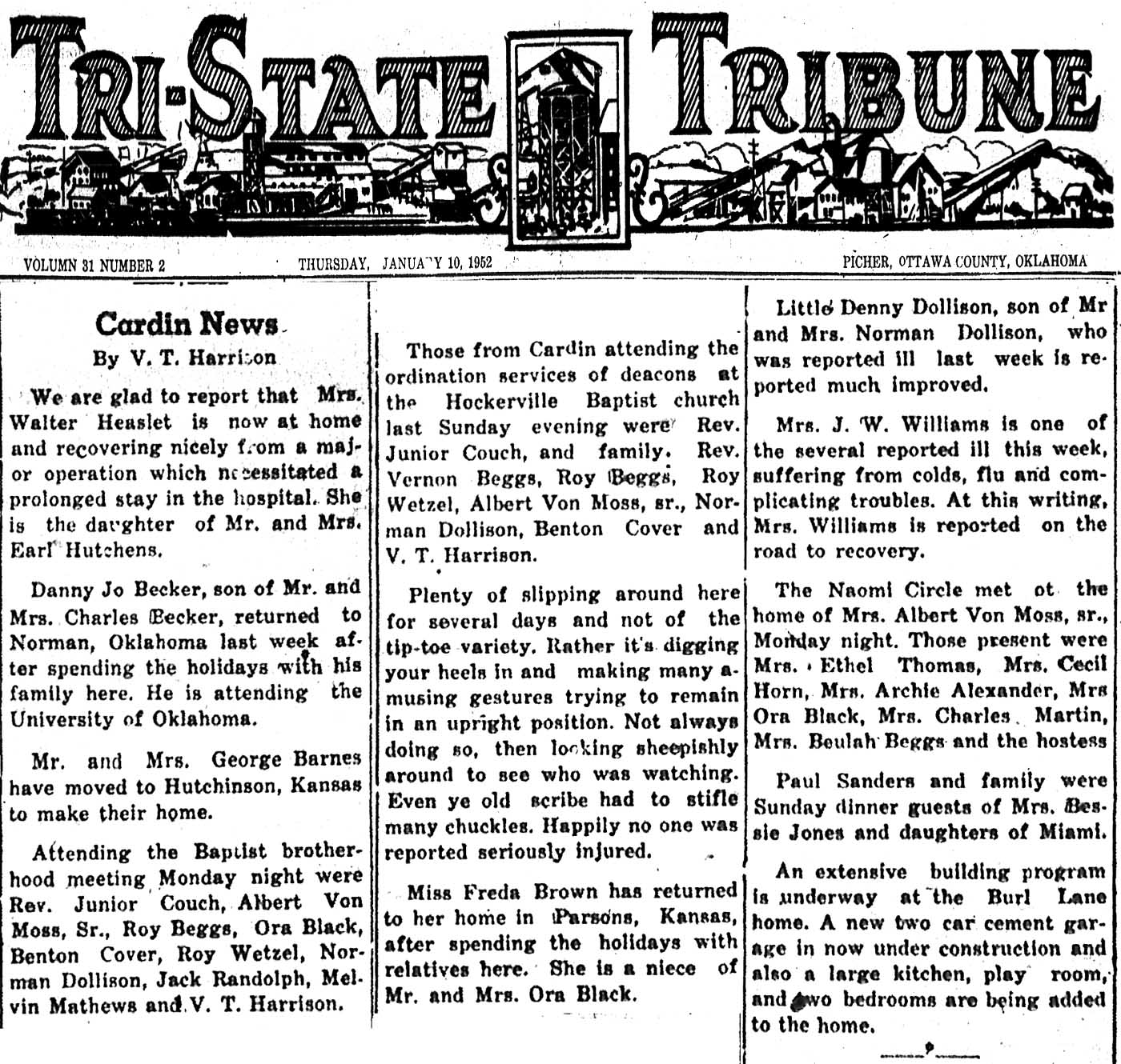Walter Heaslet. Earl Hutchins, Danny Jo & Charles Becker. George Barnes, Junior Couch, Albert VonMoss. Roy Beggs, Ora Black, Benton Cover, Roy Wetzel, Norman Dollison. Melvin Mathews, Virgil T. Harrison, Vernon Beggs,