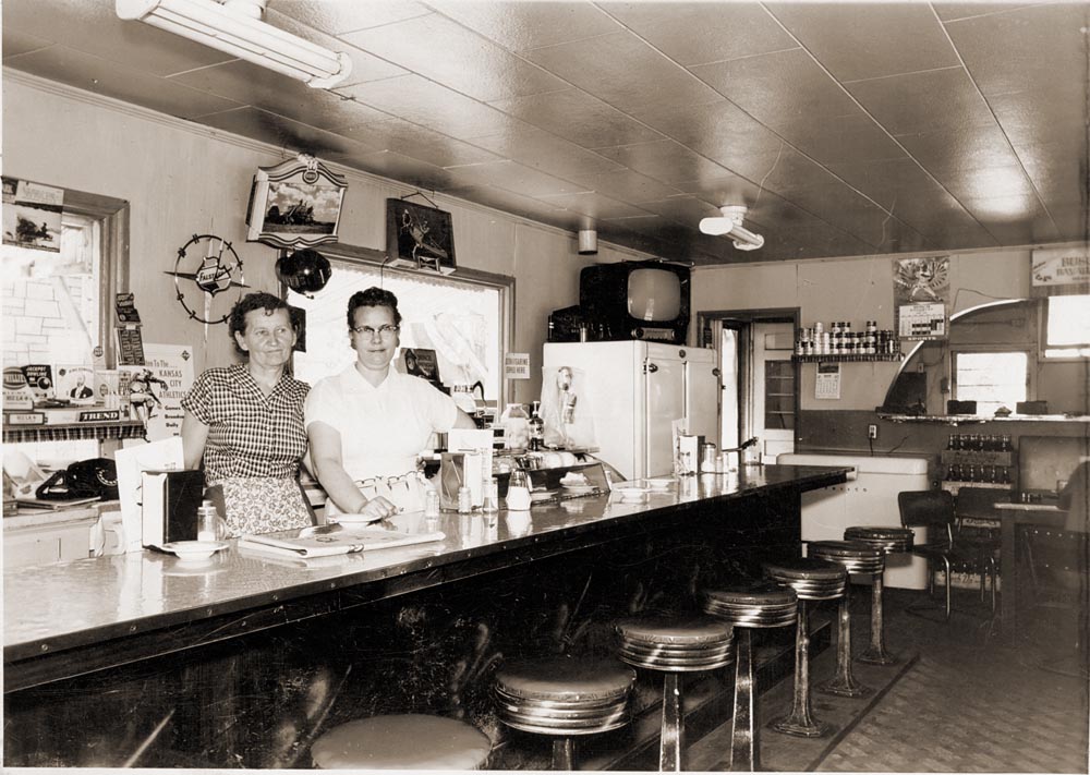 Bessie Newcomb and owner Esther Skelton behind the counter of the Cozy/Skelton's Cafe.You just have to cherish the Falstaff clock!