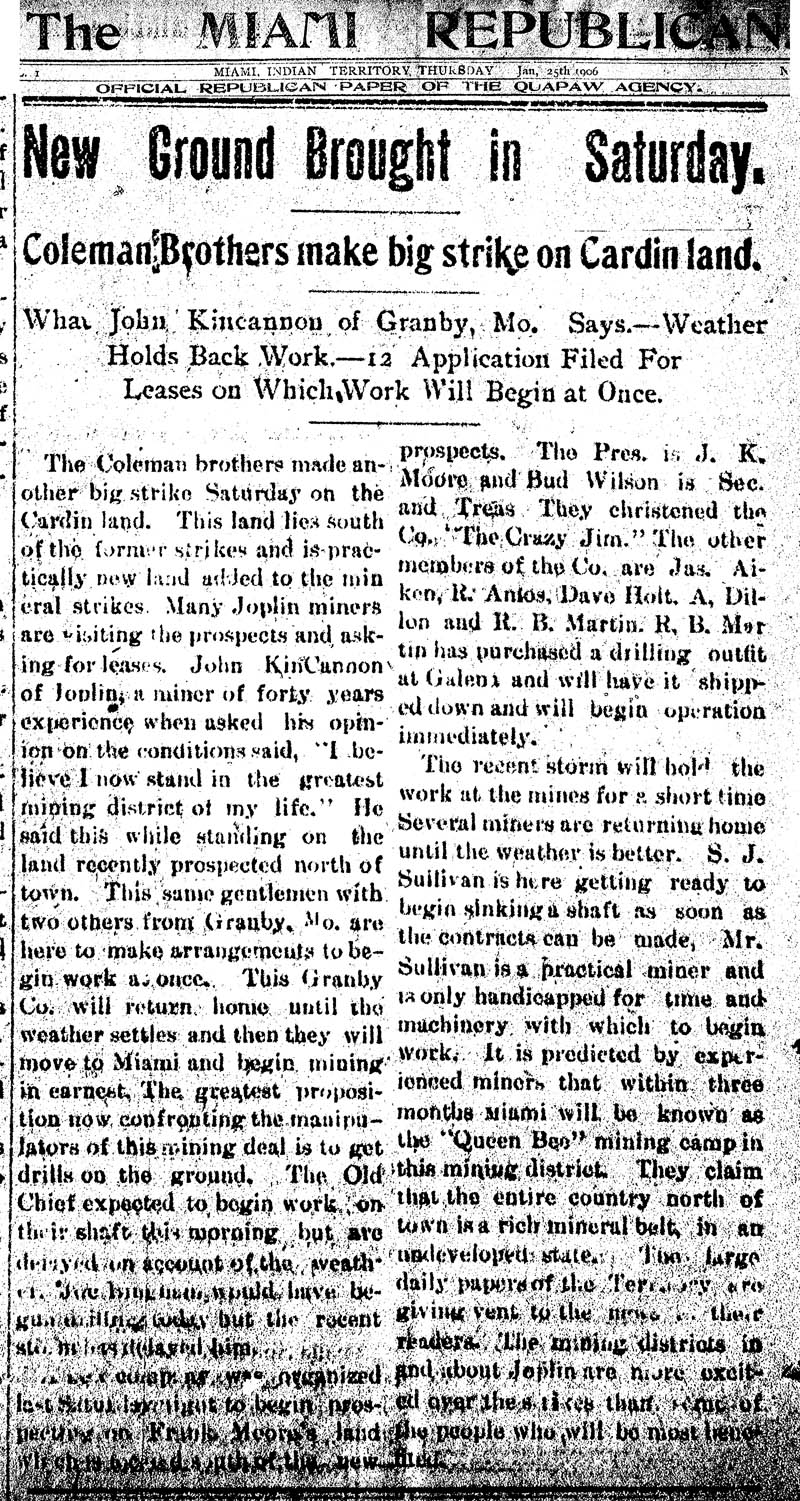 | Notice the January 25, 1906 date. This is misleading in that the Cardin land in the story was 40 acres on the south edge of Hattenville (Commerce) at the time. W. O. Cardin also owned 40 acres south of Century (Douthat) that was extensively mined besides the 40 acres that became the town of Cardin. |