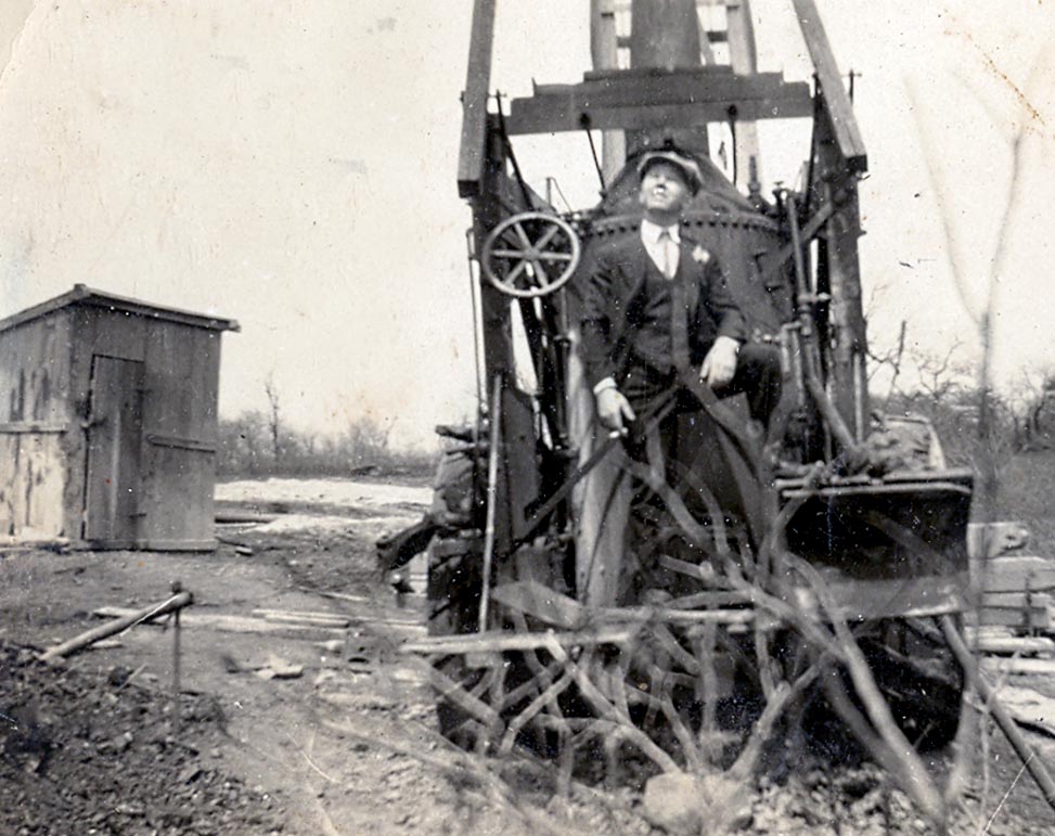 This is a steam driven, self propelled Drill Rig from the rear. Notice the steel wheels, with the bars (lugs) attached. This guy is obviously not the operator!