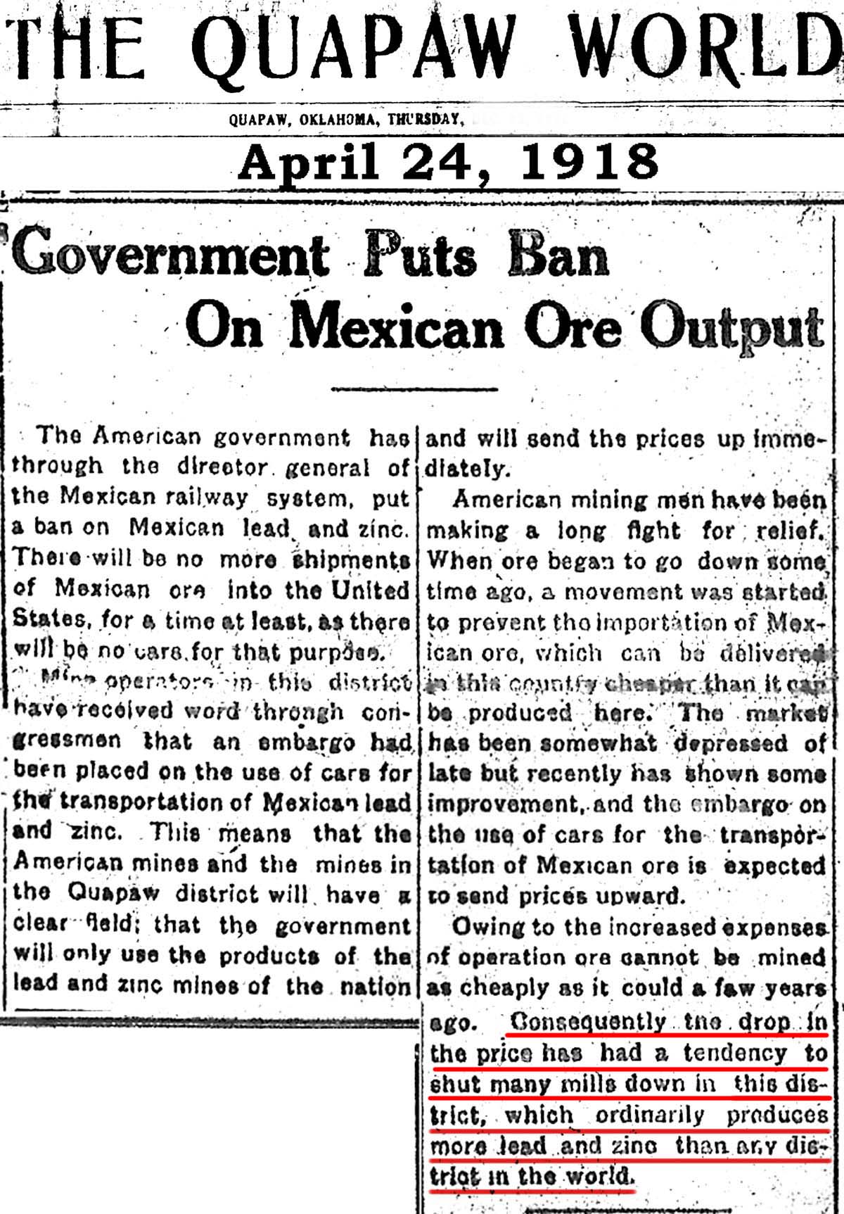 The public has forgotten the fact that our mining has always been at the mercy of imports. Unionizing of labor narrowed the profit margin so much our local mines shut down. The local mines "played out" is not what caused the mining to cease in Ottawa County. Perhaps in the Picher field, but not in the whole area. |