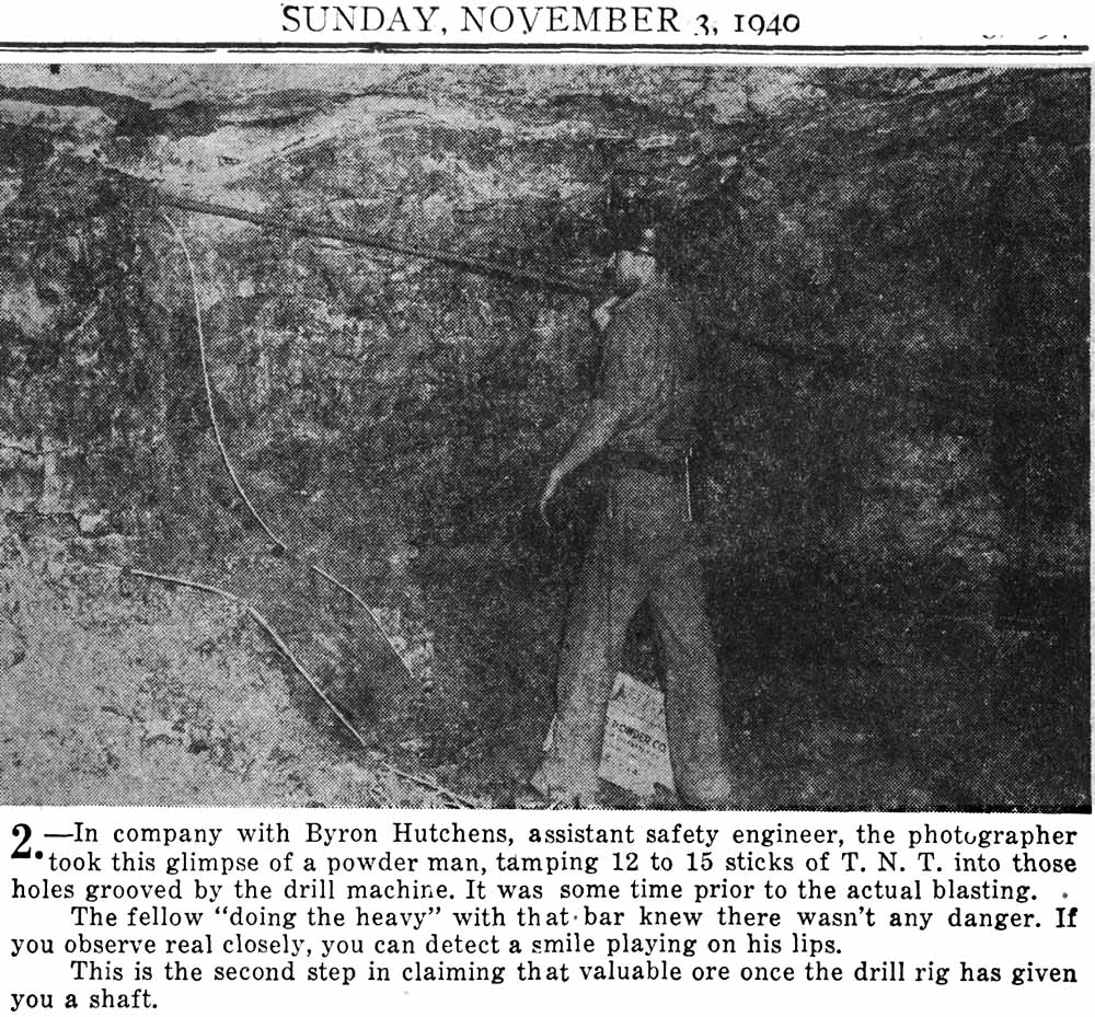 "T. N. T." and "bar" are what we called "Dynamite" and "Powder pole", but you see how it was done,any way. I never heard "drilling" called "grooved" before, either.