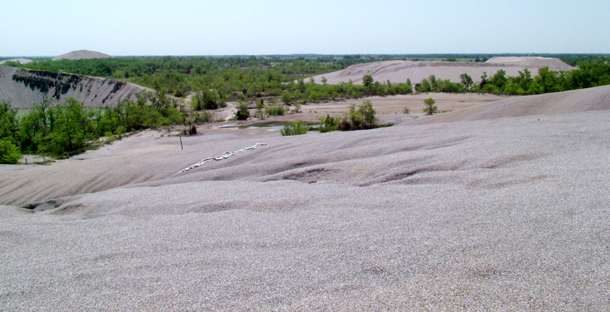 Looking farther south, you can see what's left of "Sooter's Chat Pile". It's being hauled away daily. This view also shows the funny colored water at the Rialto cave in.