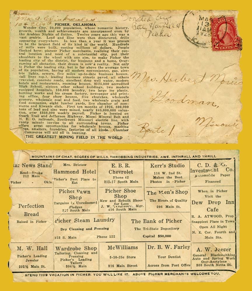 Picher promoted itself well in the 1920s as evidenced by this printed envelope.Notice the postmark is Treece, KS, Mar 13, 1928!I really like the Vacation line!!!