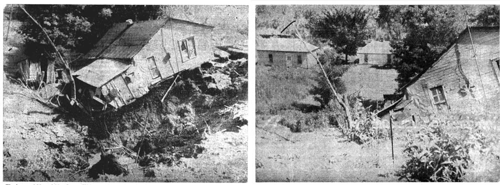 The house of Mr. and Mrs. George Foote, perched on the edge of the Cave-in, and at about a forty-five degree angle on the east side of the site. Foote, his wife and their ten children scrambled through awindow to "higher ground"
