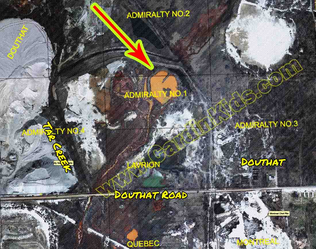 | The media has been telling the public for years how polluted Tar Creek is at Picher and Cardin. This aerial photo shows Tar Creek running clear until it reaches 040 Road. (Douthat Road) That is where the "orange" water joins Tar Creek, a mile south of either town. |