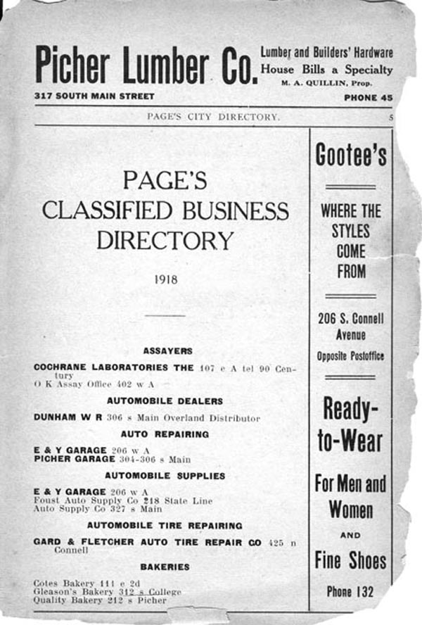 PAGE'S 5 CLASSIFIED BUSINESS DIRECTORY 1918 ASSAYERS COCHRANE LABORATORIES THE 107 e A tel 90 Cen- tury O K Assay Office 402 w A AUTOMOBILE DEALERS DUNHAM W R 306 n Main Overland Distributor AUTO REPAIRING E & Y GARAGE 206 w A PICHER GARAGE 304-306 n Main AUTOMOBILE SUPPLIES E & Y GARAGE 206 w A Foust Auto Supply Co 218 State Line Auto Supply Co. 327 n Main AUTOMOBILE TIRE REPAIRING GARD & FLETCHER AUTO TIRE REPAIR CO 425 n Connell BAKERIES Coles Bakery 111 e 2nd Gleason’s Bakery 312 s College |