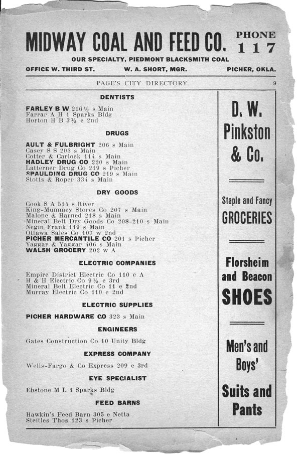 DENTISTS PARLEY B W 216 ˝ s Main Farran A H 1 Sparks Building Horton H B 31/2 e 2nd DRUGS AULT & FULBRIGHT 206 s Main Casey S S 203 s Main Cotter & Carlock 114 s Main HADLEY DRUG CO 220 s Main Latterner Drug Co 219 s Picher SPAULDING DRUG CO 219 s Main Stotts & Roper 334 s Main DRY GOODS Cook S A 514 s River King-Mummey Stores Co 207 s Main Malone & Harned 218 s Main Mineral Belt Dry Goods Co 208-210 s Main Negin Frank 119 s Main Ottawa Sales Co 107 w 2nd PICHER MERCANTILE CO 201 s Picher Yagger & Yagger 406 s Main WALSH GROCERY 202 w A ELECTRIC COMPANIES Empire Districe Electric Co 110 e A H & H Electric Co 91/2 e 3rd Mineral Belt Electric Co 11 e 2nd Murray Electric Co 110 e 2nd ELECTRIC SUPPLIES PICHER HARDWARE CO 323 s Main ENGINEERS Gates Construction Do 10 Unity Bldg EXPRESS COMPANY Wells-Fargo & Co Express 209 e 3rd EYE SPECIALIST Ebstone M L Sparks Bldg FEED BARNS Hawkin’s Feed Barn 305 e Netta Steitles Thos 123 s Picher |