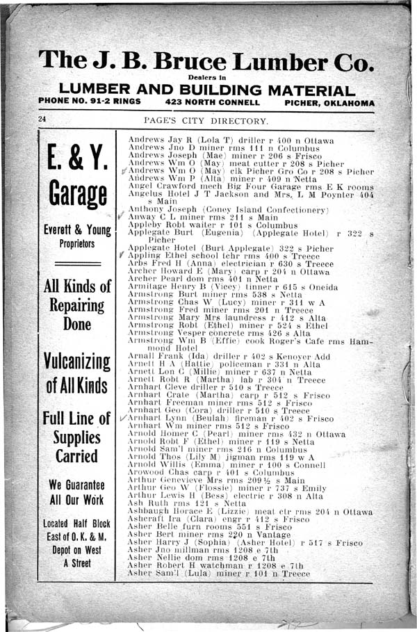 Andrews Jay R (Lola T) driller r 400 n Ottawa Andrews Jno D miner rms 111 n Columbus Andrews Joseph (Mae) miner r 206 s Frisco Andrews WM O (May) meat cutter r 208 s Picher Andrews Wm O (May) clk Picher Gro Co r 208 s Picher Andrews Wm P (Alta) miner r 109 n Netta Angel Crawford mech Big Four Garage rms E K rooms Angelus Hotel J T Jackson and Mrs. L M Poynter 404 s Main Anthony Joseph (Coney Island Confectionery) Anway C L miner rms 211 s Main Appleby Robt waiter r 101 s Columbus Applegale Burt (Eugenia) (Applegate Hotel) r 322 s Picher Applegale Hotel (Burt Applegate) 322 s Picher Appling Ethel school tchr rms 400 s Treece Arbs Fred H (Anna) electrician r 630 s Treece Archer Howard E (Mary) carp r 204 n Ottawa Archer Pearl dom rms 401 n Netta Armitage Henry B (Vicey) tinner r 615 s Oneida Armstrong Burt miner rms 538 s Netta Armstrong Chas W (Lucy) miner r 311 w A Armstrong Fred miner rms 201 n Treece Armstrong Mary Mrs laundress r 412 s Alta Armstrong Robt (Ethel) miner r 521 s Ethel Armstrong Vesper concrete rms 426 s Alta Armstrong Wm B (Effie» cook Roger's Cafe rms Ham- mond Hotel Arnall Frank (Ida) driller r 102 s Kenoyer Add Arnett H A (Hattie) policeman r 331 n Alta Arnett Lon C (Millie) miner r 637 n Netta Arnett Robt R (Martha) lab r 301 n Treece Arnhart Cleve driller r 510 s Treece Arnhart Crate (Martha) carp r 512 s Frisco Arnhart Freeman miner rms 512 n Frisco Arnhart Geo (Cora) driller r 510 s Treece Arnhart Lynn (Beulah) fireman r 402 s Frisco Arnhart Wm miner rms 512 s Frisco Arnold Homer C (Pearl) miner rms 132 n Ottawa Arnold Robt F (Ethel) miner r 119 s Netta Arnold Sam'l miner rms 216 n Columbus Arnold Thos (Lily M) jigman rms 119 w A Arnold Willis (Emma) miner r 100 s Connell Arowood Chas carp r 404 s Columbus Arthur Genevieve Mrs rms 209 ˝ s Main Arthur Geo W (Flossie) miner r 737 s Emily Arthur Lewis H (Bess) electric r 308 n Alta Ash Ruth rms 121 s Netta Ashbaugh Horace E (lizzie) meat ctr rms 201 n Ottawa Ashcraft Ira (Clara) engr r 412 s Frisco Asher Belle furn rooms 551 s Frisco Asher Bert miner rms 220 n Vantage Asher Harry J (Sophia) (Asher Hotel) r 517 s Frisco Asher Jno miillman rms 1208 e 7th Asher Nellie dom rms 1208 e 7th Asher Robert H watchman r 1208 e 7th Asher Sam'l (Lula) miner r 101 n Treece |