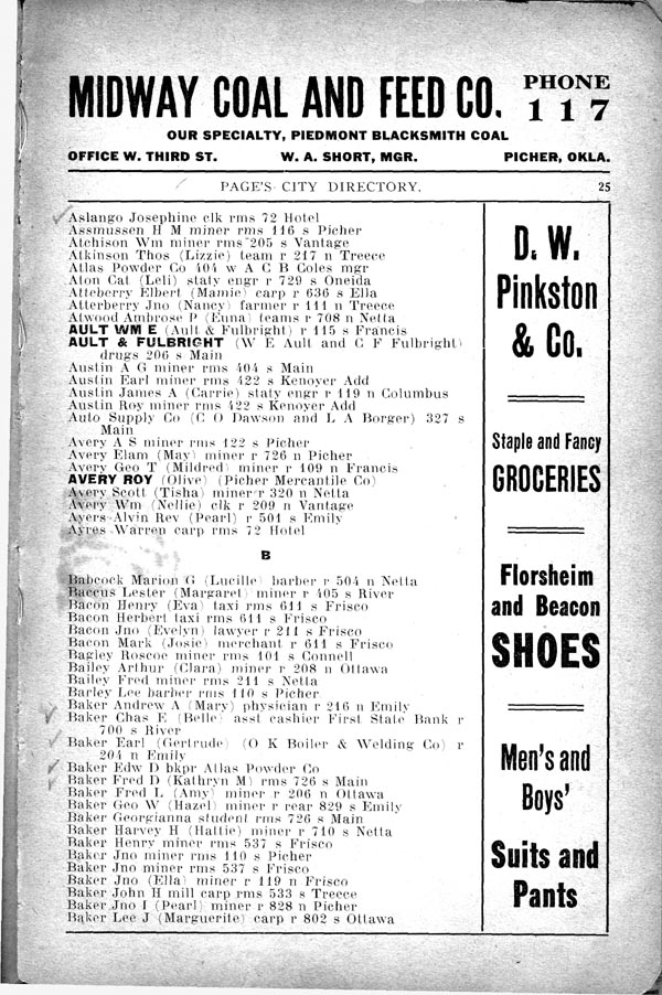 Aslango Josephine clk rms 72 Hotel Assmussen H M miner rms 116 s Picher Atchison Wm miner rms 205 s Vantage Atkinson Thos (Lizzie) team r 217 n Treece Atlas Powder Co 404 w A C B Coles mgr Aton Cal (Leli) staty engr r 729 s Oneida Atteberry Elbert (Mamie) carp r 636 s Ella Atterberry Jno (Nancy) farmer 111 n Treece Atwood Ambrose P (Enna) teams r 708 n Netta AULT WM E (Ault & Fulbright) r 115 s Francis AULT & FULBRIGHT (W E Ault and C F Fulbright ) drugs 206 s Main Austin A G miner rms 404 s Main Austin Earl miner rms 422 s Kenoyer Add Austin James A (Carrie) staty engr r 110 n Columbus Austin Key miner rms 122 s Kenoyer Add Auto Supply Co (C O Dawson and L A Borger) 327 s Main Avery A S miner rms 12 s Picher Avery Elam (May) miner r 726 n Picher Avery Geo T (Mildred) tinner r 109 n Francis AVERY ROY (Olive) (Picher Mercantile Co) Avery Scott (Tisha) miner r 320 n Netta Ayers Wm (Nellie) clk r 209 n Vantage Ayers Alvin Rev (Pearl) r 501 s Emily Ayres Warren carp rms 72 Hotel B Babcock Marion (Lucille) barber r 504 n Netta Baccus Lester (Margaret) miner r 405 s River Bacon Henry (Eva) taxi rms 611 s Frisco Bacon Herbert taxi rms 611 s Frisco Bacon Jno (Evelyn) lawyer r 211 s Frisco Baron Mark (Josie) merchant r 611 s Frisco Bagley Roscoe miner rms 101 s Connell Bailey Arthur (Clara) miner r 208 n Ottawa Bailey Fred miner rms 211 s Netta Barley Lee barber rms110 s Picher Baker Andrew A (Mary) physician r 216 n Emily Baker Chas E (Belle) asst cashier First Stale Bank r 700 s River Baker Earl(Gertrude) (O K Boiler & Welding Co) r 204 n Emily Baker Edw bkpr Atlas Powder Co Baker Fred H (Kathryn M) rms 726 s Main Bnker Fred L (Amy) miner r 206 n Ottawa Baker Geo W (Hazel) miner r rear 829 s Emily Baker Georgianna student rms 726 s Main Baker Harvey H (Hattie) miner r 710 s Netta Baker Henry miner rms 537 s Frisco Baker Jno miner rms 110 s Picher Baker Jno miner rms 537 s Frisco .Baker Jno (Ella) miner r 119 n Frisco Baker John H mill carp rms 533 s Treece Baker Jno I (Pearl) miner r 828 n Picher Baker Lee J (Marguerite) carp r 802 s Ottawa |