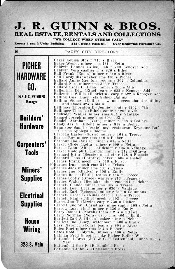 Baker Louisa Mrs r 713 s River Baker Wesley miner rms 131 n Netta Baldwin Lannes (Alice) labr 720 Kenoyer Add Baldwin Vera cashier rms 826 s Ethel Ball Frank (Norma) miner r 610 s River Ball Hardy dishwasher rms 101 s Picher Ballurd Annie Mrs turn rooms r 302 n Columbus Ballard Nero miner rms 323 n Treece Ballard Oscar L (Lena) miner r 206 s AIta Ballentine Edw (Ethel) carp r 622 s Kenoyer Add Ballentine Willis (Henrietta) carp r 622 s Kenoyer Add Balling Gus (Lucy) clk Sidney Balling Balling Sidney (Dollie) new and secondhand clothing and shoes 321 s Main Ballinger Thornton E (Jennie) contr r 1202 e 7th Ballinger Thos R (Ethel) contr r 1202 e 7th Baldridge Walter miner rms 831 s Vantage Banard Joseph miner rms 304 n Ella Bandell Abraham (Vera) miner r 628 s College Bandy Jas G (Ellen) miner r 818 n Picher Bannister Sam’l (Jessie) mgr restaurant Keystone Buf- fet and Applegate Rooms Barbeau Harley (Susie) miner r 161 n Treece Barber Roy miner rms 110 s Picher Barker Clyde (Retta) miner r 609 n Netta Barnard Eli A (Bessie) meat cir r 128 n Francis Barnes Frank mech rms 518 s Frisco Barnes Iram mech rms 518 s Frisco Barnes Jack miner rms 537 s Frisco Barnes Jno (Gladys) r 406 n Emily Barnes Ross (Edith) teams r 116 n Treece Barnes Scotty (Grace) waiter r 213 n Francis Barnes Walter (Beulah) miner rms 101 s Picher Barnett Claude miner rms 107 n Treece Barnett Dee (Lee) miner r 630 s Vantage Barnett Earl (Rebecca) miner r 317 n Columbus Barnett Oscar L (Nina) carp r 424 n Treece Barnett Paul (Tillie) mech r 303 n Treece Barret Jno T (Lizzie) carp r 738 n Picher Barrett Jno W (Christina( mine supt r 108 s Netta Barrow Luke (Ina) miner r 336 s Emily Barry James I (Norah) team r 214 n Ottawa Barry Norman (Nora) carp rms 106 n Emily Bartlett Carl A (Helen) baker r 212 s Picher Bartlett Jno (Lucy) watchman r 108 n Emily Bass Clarence (Cora) teams r 804 s River Bates Burt miner rms 314 s Picher Bates Robt T (Myrtle) miner r 406 n Netta Batman Fred G boiler mkr Picher Boiler Wks Battenfield Bros (J Y & G F Battenfield) lunch 320 s Main Battenfield Geo F (Battenfield Bros) Battenfield John Y (Battenfield Bros) |