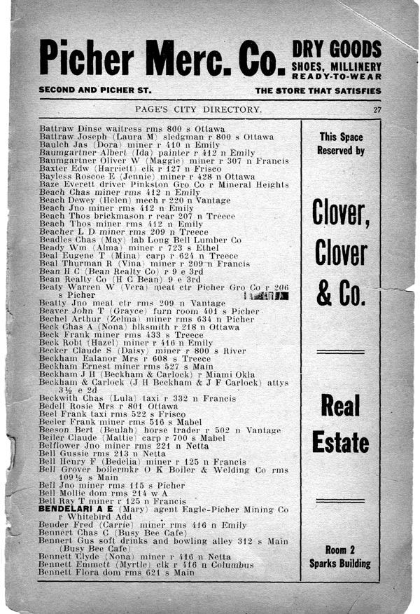 aw Dinse waitress rms 800 s Ottawa Battraw Joseph (Laura M) sledgman r 800 s Ottawa Baulch Jas (Dora) miner r 410 n Emily Baumgartner Albert (Ida) painter r 412 n Emily Baumgartner Oliver W (Maggie) miner r 307 n Francis Baxter Edw (Harriett) clk r 127 n Frisco Bayless Roscoe E (Jennie) miner r 128 n Ottawa Baze Everett driver Pinkston Gro Co r Mineral Heights Beach Chas miner rms 112 n Emily Beach Dewey (Helen) mech r 220 n Vantage Beach Jno miner rms 412 n Emily Beach Thos brickmason r rear 207 n Treece Beach Thos miner r rms 412 n Emily Beacher L D miner rms 209 n Treece Beadles Chas (May) lab Long Bell Lumber Co Beady Wm (Alma) miner r 723 s Ethel Beal Eugene T (Mina) carp r 624 n Treece Beal Thurman K (Vina) miner r 209 n Francis Bean H C (Bean Realty Co r 9 e 3rd Bean Realty (H C Bean) 9 e 3rd Beaty Warren W (Vera) meat ctr Picher Gro r 206 s Picher Beatty Jno meat ctr rms 209 n Vantage Beaver John T (Grace) furn rooms 101 s Picher Bechel Arthur (Zelma) miner rms 634 n Picher Beck Chas A (Nona) blksmith r 218 n Ottawa Beck Frank miner rms 433 s Treece Beck R0bt (Hazel) miner r 110 n Emily Becker Claude S (Daisy) miner r 800 s River Beckham Ealanor Mrs r 608 s Treece Beckham Ernest miner rms 527 s Main Beckham J H (Beckham & Carlock) r Miaimi Okla Beckham & Carlock (J H Beckham & J F Carlock ) attys 3 ½ e 2d Beckwith Chas (Lula) taxi r 332 n Francis Bedell Rosie Mrs r 801 Ottawa Beel Frank taxi rms 522 s Frisco Beeler Frank miner rms 516 s Mabel Beeson Bert (Beulah) horse trader r 502 n Vantage Beiler Claude (Mattie) carp r 700 s Mabel Belflower Jno miner rms 221 n Netta Bell Gussie rms 213 n Netta Bell Henry F (Bedelia) miner r 125 n Francis Bell Grover boilermkr O K Boiler & Welding Co rms 109 ½ s Main Bell Jno miner rms 115 s Picher Bell Mollie dom rms 214 w A Bell Ray T miner r 125 n Francis BENDALARI A E (Mary) agent Eagle Picher Mining Co r Whitebird Add Bender Fred (Carrie) miner rms 116 n Emily Bennert Chas C (Busy Bee Cafe) Bennert Gus soft drinks and bowling alley 312 s Main (Bu»y Bee Cafe) Bennett Clyde (Nona) miner r 110 n Netta Bennett Emmett (Myrtle) clk r 416 n Columbus Bennett Flora dom rms 624 s Main |