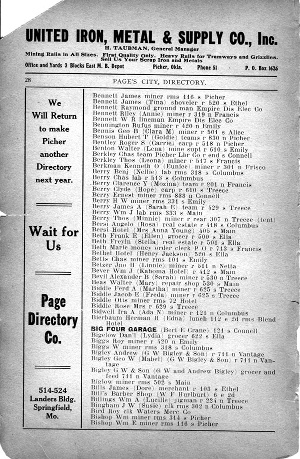 Bennett James miner rms 110 s Picher Bennett James (Tina) shoveler r 520 s Ethel Bennett Raymond ground man Empire Dis Elec Co Bennett Riley (Annie) miner r 319 n Francis Bennett W R lineman Empire Dis Elec Co Bennington Rufus miner r 120 n Ernily Bennis Geo B (Clara M) miner r 501 s Alice Benson Hubert T (Goldie) teams r 830 n Picher Bentley Roger S (Carrie) carp r 518 n Picher Benton Walter (Lena) mine supt r 010 s Emily Berkley Chas team Picher Lbr Co r end s Connell Berkley Thos (Leona) miner r 517 s Francis Berkman Kennelh O (Eunice) miner r 301 n Frisco Berry Benj (Nellie) lab rms 318 s Columbus Berry Chas lab r 513 s Columbus Berry Clarence Y (Mozina) team r 201 n Francis Berry Clyde (Hope) carp r 610 s Treece Berry Ernest miner rms 833 n Connell Berry H W miner rms 331 s Emily Berry James A (Sarah E) team r 129 s Treece Berry Wm J lab rms 333 s Main Berry Thos (Minnie) miner r rear 307 n Treece (tent) Bersi Angelo (Rosa) real estate r 118 s Columbus Bersi Hotel (Mrs Anna Young) 105 s Main Beth Frank E (Ellen) grocer r 500 s Ella Beth Freyln (Stella) real estate r 501 s Ella Beth Marie money order clerk P O r 713 s Francis Bethel Hotel (Henry Jackson) 520 s Ella Betis Chas miner rms 101 s Emily Betzer Jno H (Linnie) miner r 511 n Netta Bever Wm J (Kahoma Hotel) r 112 s Main Bevil Alexander B (Sarah) miner r 530 n Treece Beas Walter (Mary) repair shop 530 s Main Biddle Ferd A (Martha) miner r 625 s Treece Biddle Jacob E (Freda) miner r 625 s Treece Biddle Otis miner rms 72 Hotel Biddle Rose Mrs r 629 s Treece Bidwell Ira A (Ada N) miner r 121 n Columbus Bierbaum Herman H (Edna) lunch 112 e 2d rms Blend Hotel BIG FOUR GARAGE (Bert E Crane) 121 s Connell Bigelow Dan'l (Lydia) grocer 622 s Ella Biggs Roy miner r 420 n Emily Biggs W miner rms 318 s Columbus Bigley Andrew (G W Bigley & Son) r 711 n Vantage Bigley Geo W (Mabel) (G W Bigley & Son) r 711 n Van- tage Bigley G W & Son (G W and Andrew Bigley) grocer and feed 711 n Vantage Biglow miner rms 502 s Main Bills James (Dore) merchant r 103 s Ethel Bill's Barber Shop (W F Hurlburt) 6 e 2d Billings Wm A (Lucille) Jigman r 224 n Treece Bingham J W (Susie) clk rms 302 n Columbus Bird Roy clk Waters Merc Co Bishop Wm miner rms 314 e Picher |