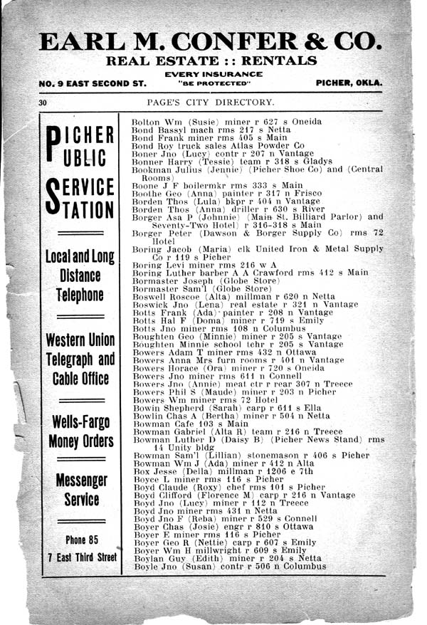 Bolton Wm (Susie) miner r 627 s Oneida Bond BassyI mach rms 217 s Netta Bond Frank miner rms 405 8 Main Bond Roy truck sales Alias Powder Co Boner Jno (Lucy) contr r 207 n Vantage Bonner Harry (Tessie) team r 318 s Gladys Bookman Julius (Jennie) (Picher Shoe Co) and (Central Rooms) Boone J F boilermkr rms 333 s Main Boothe Geo (Anna) painter r 317 n Frisco Borden Theo (Lula) bkpr r 404 n Vantage Borden Thos (Anna) driller r 630 s River Borger Asa P (Johnnie) (Main St. Billiard Parlor) and Seventy-Two Hotel r 316-318 s Main Borger Peter (Dawson & Borger Supply Co) rms 72 Hotel Boring Jacob (Maria) clk United Iron & Metal Supply Co r 119 8 Picher Boring Levi miner rms 216 w A Boring Luther barber A A Crawford rms 412s Main Bormaster Joseph (Globe Store) Bormaster Sam’l (Globe Store) Boswell Roscoe (Alta) millman r 620 n Netta Boswick Jno (Lena) real estate r 321 n Vantage Botts Frank (Ada) painter r 208 n Vantage Botts Hal F (Doma) miner r 719 s Emily Botts Jno miner rms 108 n Columbus Boughten Geo (Minnie) miner r 205 s Vantage Boughten Minnie school tchr r 205 s Vantage Bowers Adam T miner rms 432 n Ottawa Bowers Anna Mrs turn rooms r 101 n Vantage Bowers Horace (Ora) miner r 720 s Oneida Bowers Jno miner rms 611 n Connell Bowers Jno (Annie) meat ctr r rear 307 n Treece Bowers Phil S (Maude) miner r 203 n Picher Bowers Wm miner rms 72 Hotel Bowin Shepherd (Sarah) carp r 611 s Ella Bowlin Chas A (Bertha) miner r 504 n Netta Bowman Cafe 103 s Main Bowman Gabriel (Alta R) team r 216 n Treece Bowman Luther D (Daisy B) (Picher News Stand) rms 14 Unity bldg Bowman Sam’l (Lillian) stonemason r 406 s Picher Bowman Wm J (Ada) miner r 412 n Alta Box Jesse (Della) millman r 1206 e 7th Boyce L miner rms 116 s Picher Boyd Claude (Roxy) chef rms 101 s Picher Boyd Clifford (Florence M) carp r 216 n Vantage Boyd Jno (Lucy) miner r 112 n Treece Boyd Jno miner rms 431 n Netta Boyd Jno F (Reba) miner r 529 s Connell Boyer Chas (Josie) engr r 810 s Ottawa Boyer E minor rms 116 s Picher Boyer Geo R (Nellie) carp r 607 s Emily Boyer Wm H millwright r 609 s Emily Boylan Guy (Edith) miner r 204 s Netta Boyle Jno (Susan) contr r 506 n Columbus |