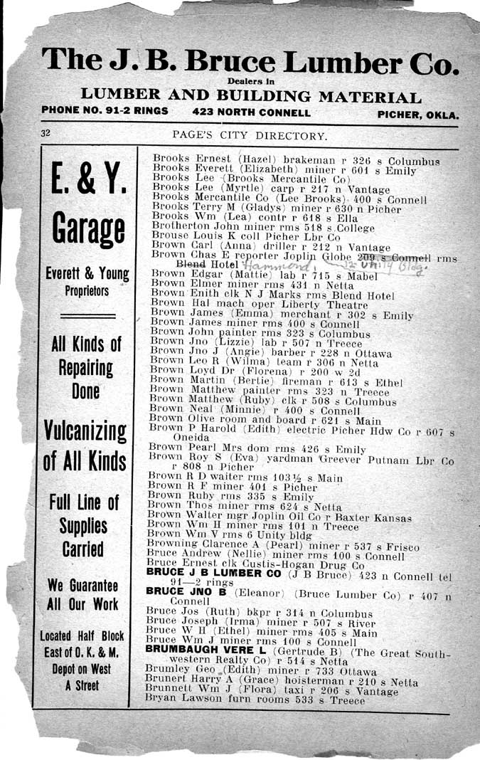 Brooks Ernest (Hazel) brakeman r 326 s Columbus Brooks Everett (Elizabeth) miner r 601 s Emily Brooks Lee (Brooks Mercantile Co) Brooks Lee (Myrtle) carp r 217 n Vantage Brooks Mercantile Co (Lee Brooks) 400 s Connell Brooks Terry M (Gladys) miner r 630 n Picher Brooks Wm (Lea) contr r 618 s Ella Brotherton John miner rms 518 s College Brouse Louis K coll Picher Lbr Co Brown Carl (Anna) driller r 212 n Vantage Brown Chas E reporter Joplin Globe 209 s Connell rms Brown Edgar (Mattie) lab r 715 s Mabel Brown Elmer miner rms 431 n Netta Brown Enith clk N J Marks rms Blend Hotel Brown Hal mach oper Liberty Theatre Brown James (Emma) merchant r 302 s Emily Brown James miner rms 400 s Connell Brown John painter rms 323 s Columbus Brown Jno (Lizzie) lab r 507 n Treece Brown Jno J (Angie) barber r 228 n Ottawa Brown Leo R (Wilma) team r 306 n Netta Brown Loyd Dr (Florena) r 200 w 2d Brown Martin (Bertie) fireman r 613 s Ethel Brown Matthew painter rms 323 n Treece Brown Matthew (Ruby) clk r 508 s Columbus Brown Neal (Minnie) r 400 s Connell Brown Olive room and board r 621 s Main Brown P Harold (Edith) electric Picher Hdw Co r 607 s Oneida Brown Pearl Mrs dom rms 426 s Emily Brown Roy S (Eva) yardman Greever Putnam Lbr Co r 808 n Picher Brown R D waiter rms 103 ½ s Main Brown R F miner 401 s Picher Brown Ruby rms 335 s Emily Brown Thos miner rms 624 s Netta Brown Walter mgr Joplin Oil Co r Baxter Kansas Brown Wm H miner rms 101 n Treece Brown Wm V rms 6 Unity bldg Browning Clarence A (Pearl) miner r 537 s Frisco Bruce Andrew (Nellie» miner rms 100 s Connell Bruce Ernest clk Custis-Hogan Drug Co BRUCE J B LUMBER CO (J B Bruce) 423 n Connell tel 91—2 rings BRUCE JNO B (Eleanor) (Bruce Lumber Co) r 407 n Connell Bruce Jos (Ruth) bkpr r 314 n Columbus Bruce Joseph (Irma) miner r 507 s River Bruce W H (Ethel) miner rms 405 s Main Bruce Wm J miner rms 100 s Connell BRUMBAUGH VERE L (Gertrude B) (The Great South- western Realty Co) r 514 s Netta |