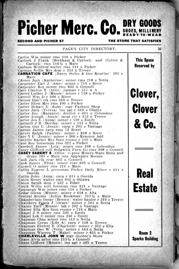Carlin Win miner rms 110 s Picher Carlock J Frank (Beckham & Carlock) and »Cotter & Carlock) rms 116 ˝ s Main Carlson Winfred waiter rms 111 s Picher Carman Nellie Mrs dom r 323 n Treece CARNATION CAFE (Harry Steles & Geo Kourias) 202 s Main Carney Jack (Katherine) miner rms 218 s Netta Carpenter Earl J (Amy) miner r 715 s River Carpenter Roy miner rms 833 n Connell Carr Clayton T (Alice) jigman r 5117 w A Carrol LutherJ (Mamie) miner r 718 n Picher Carroll Wm D r 600 s River Carson Dan'l clk rms 319 n Treece Carter Ellen Mrs rms 100 s Picher Carter Hobart F. (Ruby) mgr Fashion Shop Carter Jack (Teresa) ins agt r 616 s Gladys Carter Jno (Margaret) dentist r 601 n Columbus Carter Joseph (Annie) meat ctr r 323 n Treece Carter Jos E (Anna) miner r 420 s Emily Cartmill J B (Bertha) miner r 113 s Netta Carton Guy C (Jessie) carp r 201 n Vantage Carton James carp rms 72 Hotel Carver Ralph (Pauline) miner r 818 s River Cary V U (Jennie) miner r 3306 s Kenoyer Add Carylile Rachael Mrs furn rooms r 110 s Main Case Roy horseman rms 322 s Picher Casebolt James (Lela) miner rms 108 s Columbus Casey Clifford coll Sedgwick Furn Co rms 308 s Connell CASEY SABERT S (Olive) v.pres Miners State Bank and drugs 203 s Main rms Applegate Rooms Cash Jack clk rear 605 n Connell Cash James (Elisa) miner rear 605 n Connell Casnell O miner rms 211 s Main Catlin Eugene L pressman Picher Daily Miner r 614 s Oneida Catlin John (Anna) carp r 614 s Oneida Caton Henry waiter rms 942 n Ottawa Caton Sarah dom r 532 s Ethel Caulk Willis mill foreman rms 621 s Vantage Caunavan Wm miner rms 116 s Picher Cedar Glenn (Minnie) miner r 618 n AIta Central Rooms (Julius Bookman) 212 s Main Chamberlain Oscar (Bonnie) water hauler r 319 s Treece Chambers Frank J (Grace) miner r 501 n Netta Chaney Earl (Minnie) lab r 202 n Vantage Chaney Ella Mrs furn rooms r 710 s Main Chapel J S miner rms 330 s Emily Chapel Leb C miner rms 330 s Emily Chapman Chas miner rms 413 n Netta Chapman Cyrus (Lily A) carp r 418 n Treece Chapman Everett E (Charlotte) miner r 352 s Ella Chapman Geo W (Vena) miner r 413 n Netta Chapman Warren T (Mabel) miner r 834 n Picher CHARLEVILLE JOHN W mgr Gootee’s Store Chase Alvin actor rms 215 1/2 s Connell Chase Clifford (Minnie) ins agt r 405 n Treece |