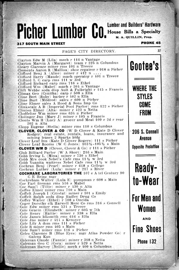 Claylon Edw M (Lila) mech r 116 n Vantage Clayton Marvin A (Margaret) team r 225 n Columbus Cleary Clarence miner rms 101 n Treece Clements Aaron R (Mallisa) shoe repairer r 918 n Picher Clifford Benj A (Alice) miner r 412 n .... (sic) Clifford Harry (Maude) mach operator r 101 n Treece Clifford L C carp rms 111 w 3rd Clifford Richard carp rms 716 s Ethel Clifford Wm (Mabel) mach r 201 n Vantage Clift Webbe soda disp Ault & Fulbright r 115 s Francis Climax Geo (Cynitha) carp r 508 s Ella Cline Bert (Ruby) barber r 402 n Ella Cline Burt (Mildred) sales r 609 n Picher Cline Elmer sales A Hood & Sons Imp Co Clinkscale A B (Imperial Pool Parlor) rms 122 s Picher Clinton Elmer (Alta) miner r 123 n Netta Clodfelter Wm miner rms 634 n Picher Clolinger Jno (Mary J) miner r 105 n Francis Clonts Wm H (Lucy A) grocer and Meat 109 e 2d r rear 202 n Alta Clopp Eugene (Stella) miner rms 110 s Columbus CLOVER, CLOVER & CO (W D Clover & Kate D Clover Rodger) real estate, rentals, loans, insurance and mining leases 2 Sparks bldg Clover Leaf Inn (Kale D Clover Rogers) 111 s Picher Clover Leaf Rooms (W C Jones) 103 ½ -105 ½ s Main CLOVER WM D (Clover, Clover & Co) r 111s Picher Club Billiard Parlor W A Short 216 s Main Cobb Irving L (Mina) miner r 730 s Ethel Cobb Mrs cook Nebel's Cafe rms 11 ½ w 3rd Cobb Yuanita waitress Nebel Cafe rms 11 ½ w 3rd Cochran Benj (Pearl) miner r 618 s College Cochran Luther (Lula) miner r 217 s River COCHRANE LABORATORIES THE 107 e A tel Century 90 C E Heinz mgr Cockreham Walter (Lula E) pumpman r 608 > Main Coe Earl fireman rms 516 s Mabel Coe Sam'l (Tillie) miner r 430 n Alta Coffee Elmer miner rms 710 s Main Coffelt Joseph I (Crystal) miner r 101 s Emily Coffelt Ralph soda disp Hadley Drug Co Coffey Walter (Ethel) r 708 s Oneida Coger Dorothy clk Harwell Merc Co rms 3l6 s Connell Cole Edw miner rms 534 s Treece Cole Gracin (Elizabeth) miner r 605 w 71h Cole Henry (Hattie) miner r 338 s Ella Cole James biksmith rms 616 s Ella Cole Jno miner r 414 s Kenoyer Cole Lily A dom rms 111 s Picher Cole R miner rms 405 s Main Cole Sam'l miner rms 116 s Picher Coles Clarence B (Blue Eyes) mgr Atlas Powder Co r Galena Kan Coleman Claude (Fannie) miner r 318 n Netta Coleman Geo C (Cora) miner r 529 s Netta Coleman Harvey (Nellie) mech r 400 n Columbus |