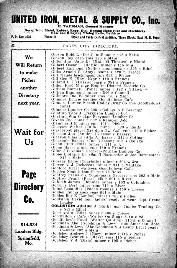 Goolsbey Andrew J (Mary) miner r 115 s Picher