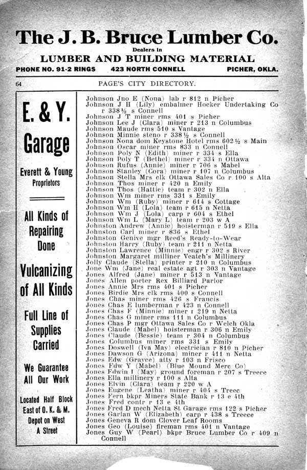 Jones Fred D mech Netta St Garage rms 122 s Picher