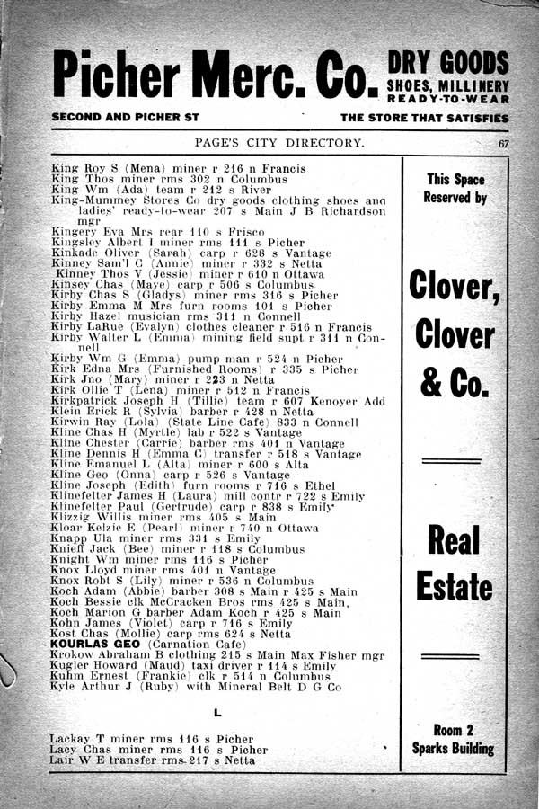 Kirby Chas H (Gladys) miner rms 316 s Picher