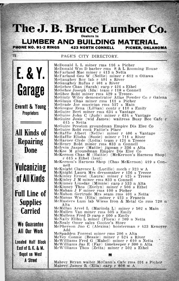 Mabrev Bryan waiter McCann's Cafe rms 101 s Picher