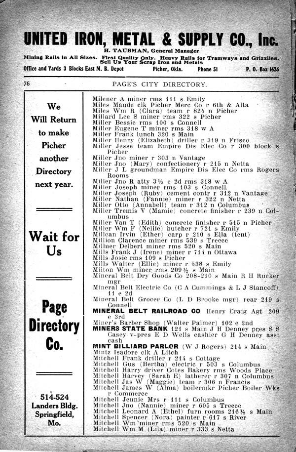 Miles Maude clk Picher Mere Co r 6th & Alta