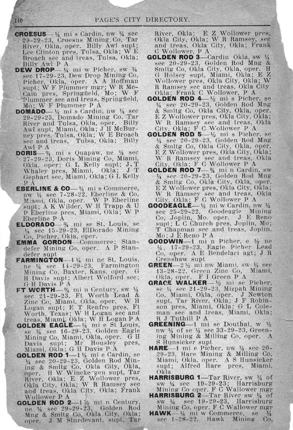 GOLDEN ROD 2-1 ½ mi n Century, ne ¼ sec 29-29-23, | GOLDEN EAGLE- ¼ mi St Louis, se ¼ sec 16-29-23, Golden Eagle Mining Co, Miami, Okla, oper, G H Davis supt; Mr Housley, pres, |