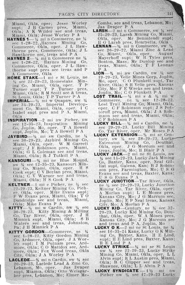 | Combs, sec and treas, Lebanon, Mo. Jas Draper PA LARSH-2 mi n Commerce, sw ¼ sec 25-29-23. Larsh Mining Co, Miami. Okla. oper. Mr Benintendi supt; H J Larsh pres, Henryetta. Okla ; LENNAN—1/4 mi n Commerce, sw ¼ sec 26-29-22, Miami Zinc & Lead Co, Miami. Okla, oper, August Mayerhoff supt; W H Tyles pres. Boston, Mass; Mr Dunlop sec and treas, Miami. Okla; T F Lennan PA LION- ¾ mi nw Cardin nw ¼ sec 19-29-23. Velie Mines Corp, Joplin, Mo, oper. C O Plunkett supt, Tar River, Okla; S H Velie pres. Kansas City, Mo; F E Weeks sec and treas. Joplin. Mo; G O Plunkett P A LOST TRAIL- ¼ mi s & ¼ mi w Commerce, ne ¼ sec12-28-22, Lost Trail Mining Co, Miami. Okla, oper. C F Robinson supt; J S Pot- toroff pres Miami. Okla; J A Rob- I inson sec and treas, Miami, Okla C F Robinson P A LUCKY BILL— ¼ mi s Cardin, ne ¼ sec 29-29-23. Lucky Bill Mining Co. Tar River Okla. Mr Moses P A LUCKY EXTENSION- ¾ mi se Cen- tury, sw ¼ sec 28-29-23. Lucky Extension Mining Co. Douthat Okla. oper. J G Morcum sec and treas, Joplin, Mo H Blair P A LUCKY JACK-2 mi ne St Louis, nw ¼ sec 14-29-23, Lucky Jack Mining Co. Baxter, Kan, oper. Neal Gil- liat supt. Galena. Kan; B J Robin- son pres. Farminton, Mo; U S G Evans sec and treas. Baxter. Kans; U S G Evans P A LUCKY JUNCTION- -Tar River, Okla. ne ¼ sec 29-29-23. Lucky Junction Mining Co. Tar River, Okla, oper; A Morlan supt; L E Moses pres, Kansas City', Mo J G Marcum sec, Joplin. Mo; E P Neal treas. Kansas City Mo; A Morlan P A LUCKY KID-Century, ne ¼ sec 32- 29-23, Lucky Kid Mining Co. Dou- that Okla, opeer W A Moses pres, Kansas City, Mo; J G Marcum sec and treas and P A, Joplin, Mo LUCKY O K-2 mi ne St Louis ne ¼ LUCKY STRIKE- ¼ mi se St Louis nw ¼ sec 22-29-23, Lucky Strike Mining Co. Miami. Okla. oper. L L Alvin supt R L Austin pres, Miami. Okla; B C Clipper sec and teas. Shawnee, Okla; L L Alvin P A LUCKY SYNDICATE – 1 ½ mi nw Picher nw ¼ sec 17-29-23 Lucky