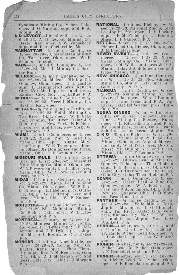 Syndicate Mining Co, Picher, Okla, oper J G Marcum supt and P A, Joplin, Mo A D LEVOOT –Lincolnville, ne ¼ sec 6-28-23, A D LeVoot Mining Co, Baxter Kan, oper , A W Vonsebeck, supt and P A. Carterville, Mo. MANHATTAN—3/4 mi ne Cardin, se ¼ sec 20-29-23, Manhattan Mil1ing Co. Tar River, Okla, opter; W H Seamon, Jr supt MARS-1 ½ mi n St Louis, nw ¼ sec 15-29-23, Merrill Mining Co, Bax ter Kan. MELROSE- 1 ½ mi n Quapaw, se ¼ sec 22-29-23, Melrose Mining Co, Quapaw, Okla, oper, J L LaRue supt; H Hannancroft pres. Kansas City, Mo; Mr Lopp sec and treas Kansas City, Mo; J L LaRue, P A MERRILL- 1 ¼ mi se St Louis, ne ¼ sec 23-29-23. Merrill Mining Co, Baxter, Kan, oper METALS- ½ mi e ¼ mi n Cardin se ¼ sec 20-29-23, Metals Milling Co, Tar River, Okla, oper, V H Sea- mon Jr supt, Tar River, Okla; J S Qualey pres, New York; E K Hen- derson sec and treas, New York; W H Seamon, P A MIAMI – ¼ mi n Commerce, ne ¼ sec 1-28-22, Miami Zinc & Lead Co, Miami, Okla, oper, august May- erhoff supt; W H Tyles pres, Bos- ton, Mass; Mr Dunlap sec and treas, Miami, Okla; T F Lennon, P A MISSOURI MULE-1 ½ ne Cen- Tury, nw ¼ sec 28-29-23. Missouri Mule Mining Co. Miami, Okla, oper W A Powers, supt; C J Fridley pres, Miami, Okla. W A Powers sec and treas and P A MIDAS—1 ½ mi ne Century, nw ¼ Sec 28-29-23, Midas Lead & Zinc Co. Miami. Okla. oper, E P Em- berline supt; L I Beland, pres. Guth- rie, Okla; W H Trapp sec and treas. Miami, Okla; W P Ember- line P A MOHUSTKA- ½ mi se Picher nw ¼ sec 21-29-23 Mohutska Mining Co, Picher, Okla, oper. W L Kap- ner supt and P A MONTREAL- Century, ne ¼ sec 32- 29-23, Montreal Mining Co, Joplin, Mo, oper C F Dykes Mgr; J P Hef- ferman and C F Dykes pres, Jop- lin, Mo; A C Kountz & C F Dykes P A MORGAN - 1 mi nw Lincolnville, se ¼ sec 26-29-23, Morgan Zinc Co, Baxter, Kans, oper. Thos Timo- thy supt Kee R McKee pres, Okla City, Okla; A J McMahan sec and treas. Okla City, Okla; R J Morgan P A |