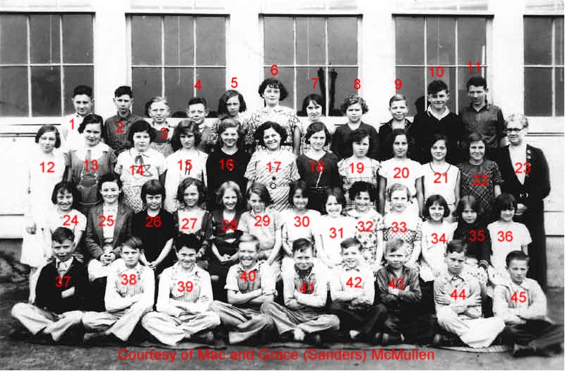 1- Billy Jim Horn, 2- Delbert Bicknell, 3- Jack Sanders, 4- Junior (Stokes) Richardson, 5- Alice Robinson, 6- Doris Dodson, 7- Oma Jean LaTurner, 8- Birdie Mae Malotte, 9- Roscoe Norton, 10- Warren Rowland, 11- Edwin Mayes, 12- Sylvenia Johnson, 13- Imogene Teeter, 14- Jean LaFalier, 15- Novella Bearden, 16- Bessie Pannell, 17- Ada Bicknell, 18- Velma Banderpool, 19- Lorena Vaugn, 20- Patty Capshaw, 21- Louise Tow, 22- Margaret Feland, 23- Mrs. Ella Coffey 24- Naomi Arnold, 25- Anna Mae Hulsey, 26- Claudia Stepp, 27- Beatrice Robinson, 28- Helen Jeffey, 29- Nadine Chaney, 30- Kitty Belle Bearden, 31- Freda Turrentine, 32- Shirley Hulsey, 33 Naomi Sanders, 34- Wanda Moyer, 35- Doris Bowling, 36- Betty Lou Haines 37- Bill Mallotte, 38- Walter Williams, 39- Richard Keck, 40- Edward Turrentine, 41- Ray Paul Heatherly, 42- Dale Mayes, 43- Tommie Turrentine, 44- ??, 45- Johnny Mattox. |