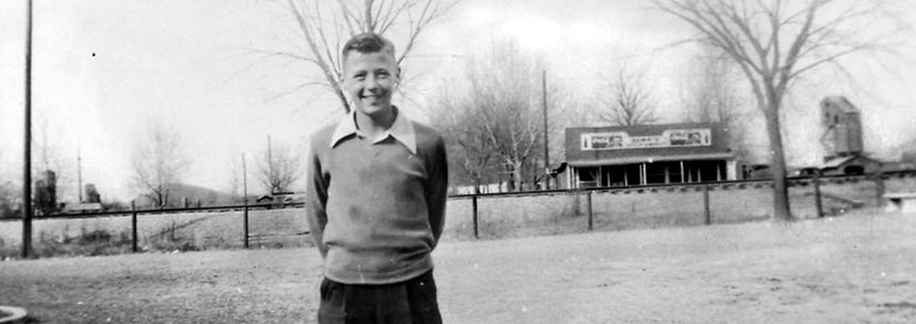 Bobby Ray, standing on the front lawn of the high school, in the 1940s.