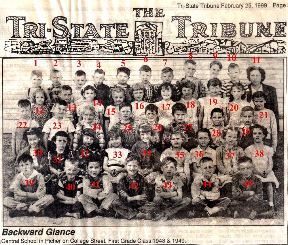 | 1- Jimmy Johnson, 2- Wendell Snow, 3- Eddie Keheley, 6- Joe Carey, (or Frankie Thompson) 7- Troy Tabor, 9- Vernon Thomas, 10- Terry Rector, 11- Mrs. Spencer, 14- Betty DeLapp, 22- Larry Carmack, 24- Jerry Luton?, 25, Roy Hart, 26- Galen Messer?, 27- Bill Potter? 29- Robert Sharp? 30 Kay June Miller, 35- Geraldine (Gerri) Tabor, 38- Charlene Peace, 39- Robert Wilson, 41- Robert Crismon, 43- Bill Peace, 44- Don Walkenshaw, 45- John Cornog Others include Phyllis Kelly, Tommy O'Brien, Mable Brown, Doug Carnahan, Raymond Herd, Karen Abernathy, Alice Mashburn, Wanda Reese and Patricia Smith |