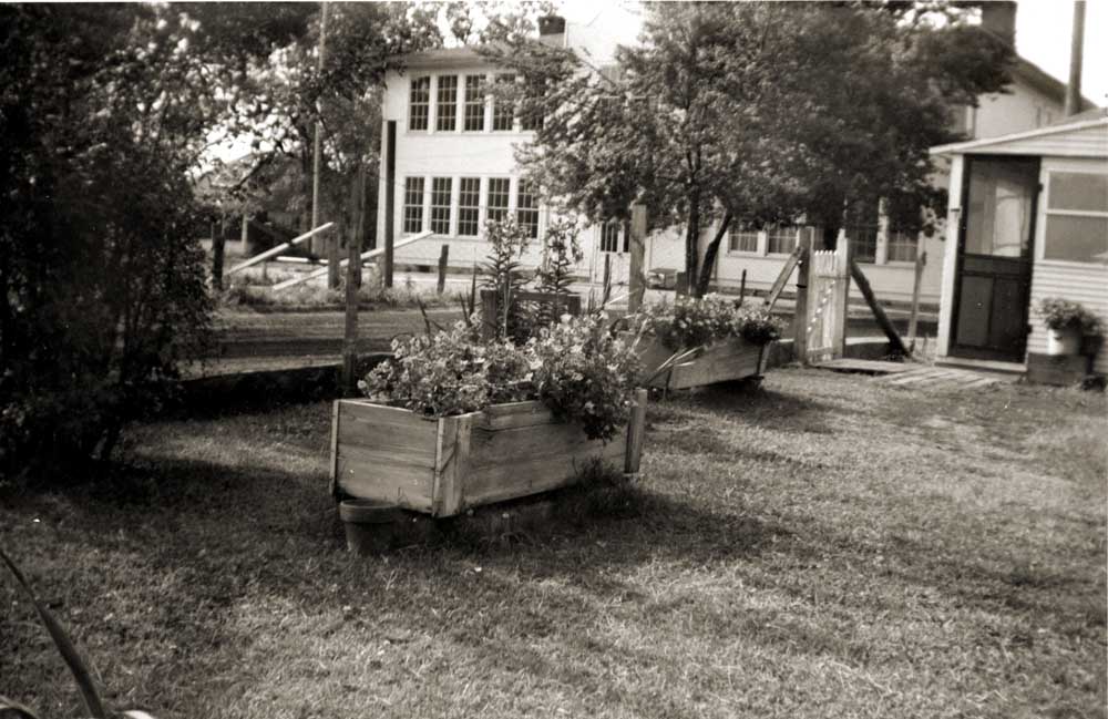 Virgil and Doris Harrison lived just west of the school's front playground.They always had beautiful flowers and gardens.This has to be an old picture because of the size of the trees on the west side of the playground.
