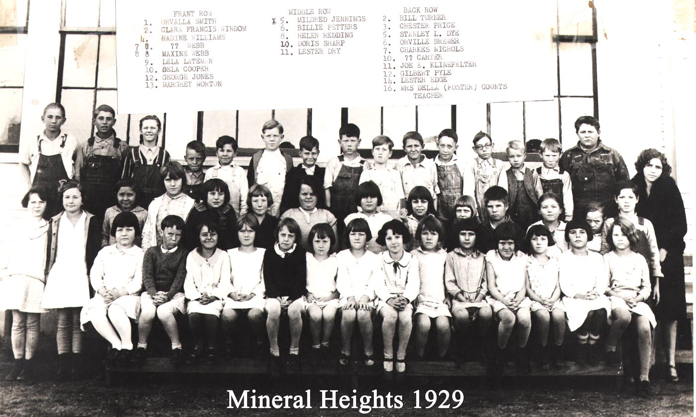 Names (as spelled) are: Orvalla Smith, Clara Francis Wisdom, Nadine Williams, ?? Webb, Maxine Webb, Lela Lateman, Dela Cooper, George Jones, Margret Morton, Mildred Jennings, Helen Redding, Doris Sharp, Lester Dry, Bill Turner, Chester Price, Stanley L. Dye, Orville Brewer, Charles Nichols, ?? Carter, Joe E. Klinefelter, Gilbert Pyle, Lester Edge, Mrs. Della (Foster) Counts, Teacher Many of these names are also on the 1926 picture, and some are spelled differently. See also 1926 See also 1932 |