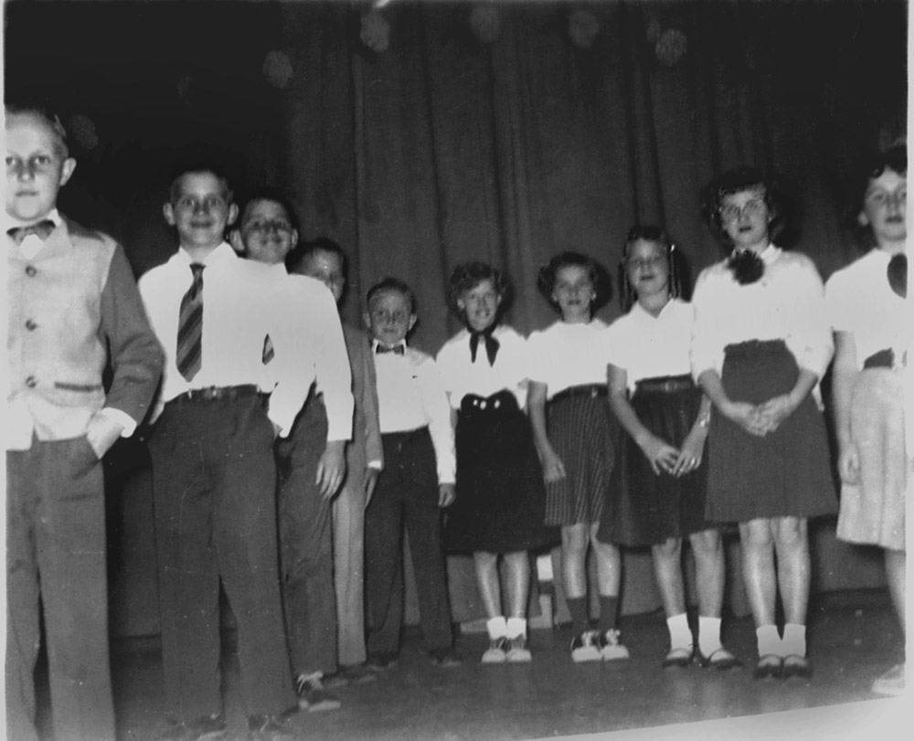 I have no recollection of what this was about. (L to R) ???, Fredas Cook, Raymond Caswell? Richard Masters, Tommy Richardson, Betty Richardson (no relation), Karen Foster, Pat Crawford, It must have been fourth or fifth grade. |