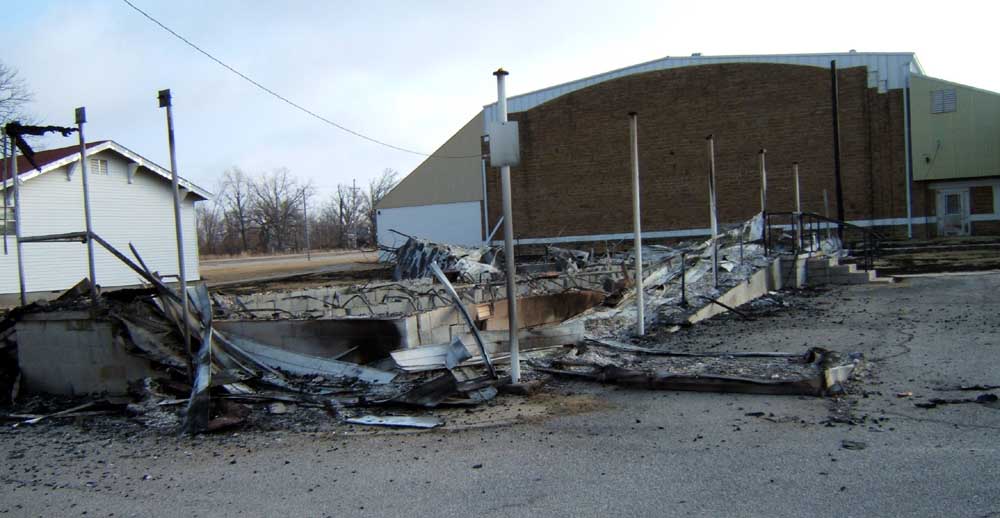 | The arsonist or arsonists that have made Cardin and Picher their playground recently has struck again! Our High School Cafeteria, which was originally a barracks at Camp Crowder, near Neosho, MO, has been burned to the ground. This doesn't reflect very well on the citizens of the area, does it? |